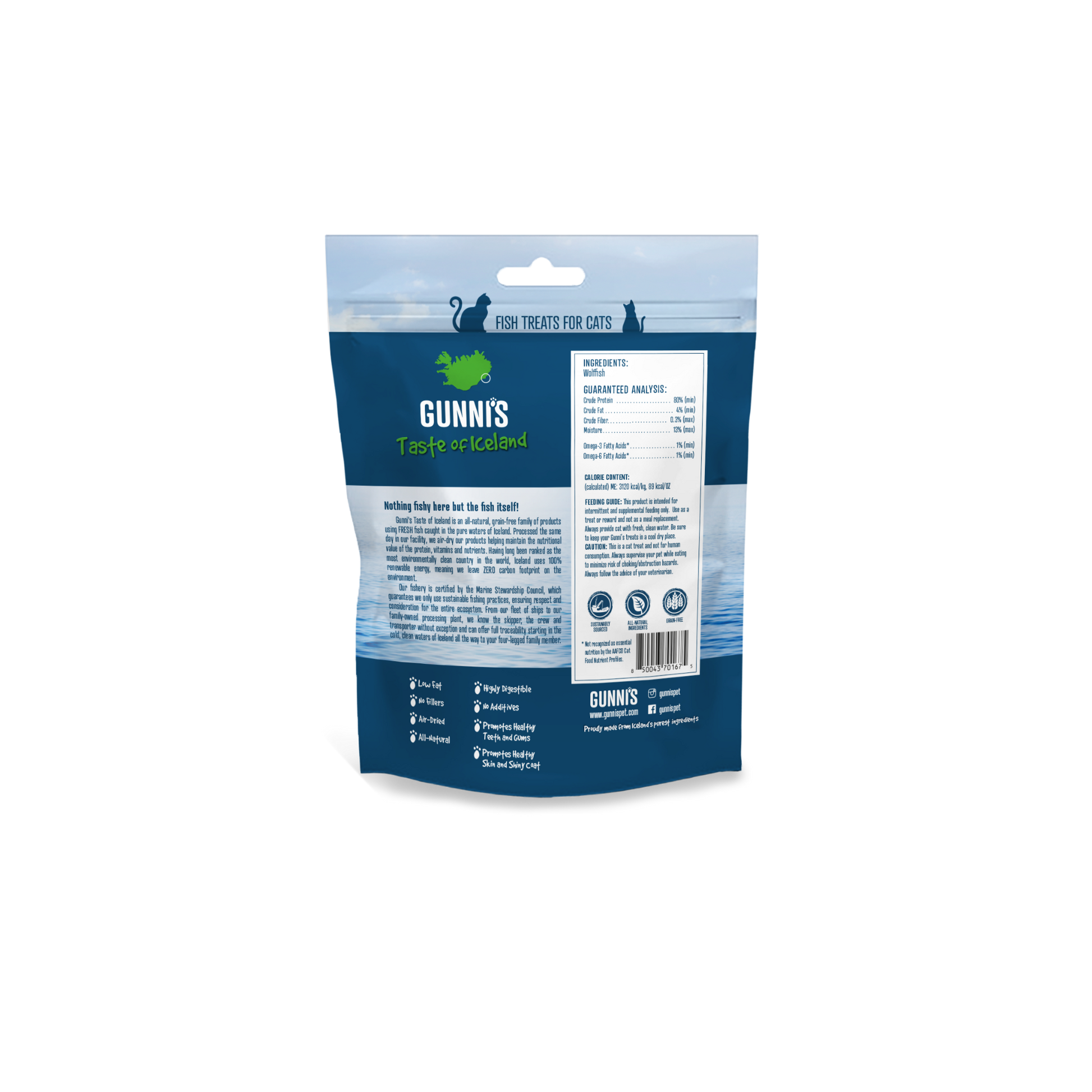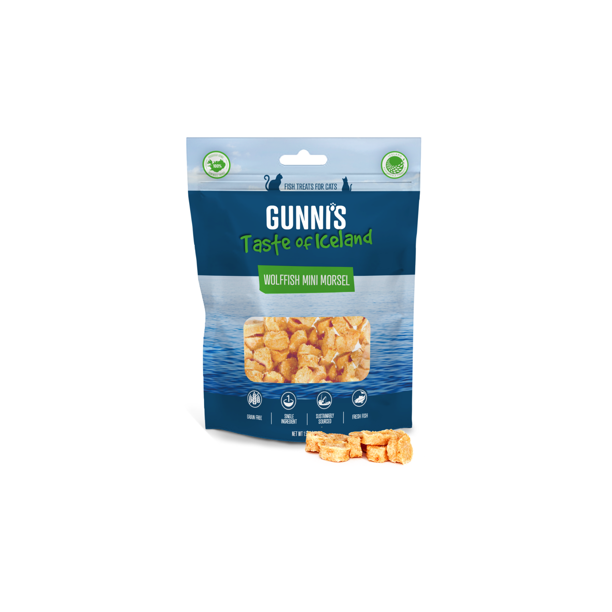 Wolffish Mini Morsel eru stökkir bitar fyrir kisur unnir úr 100% steinbítsflaki. Tilvaldir sem nammi.