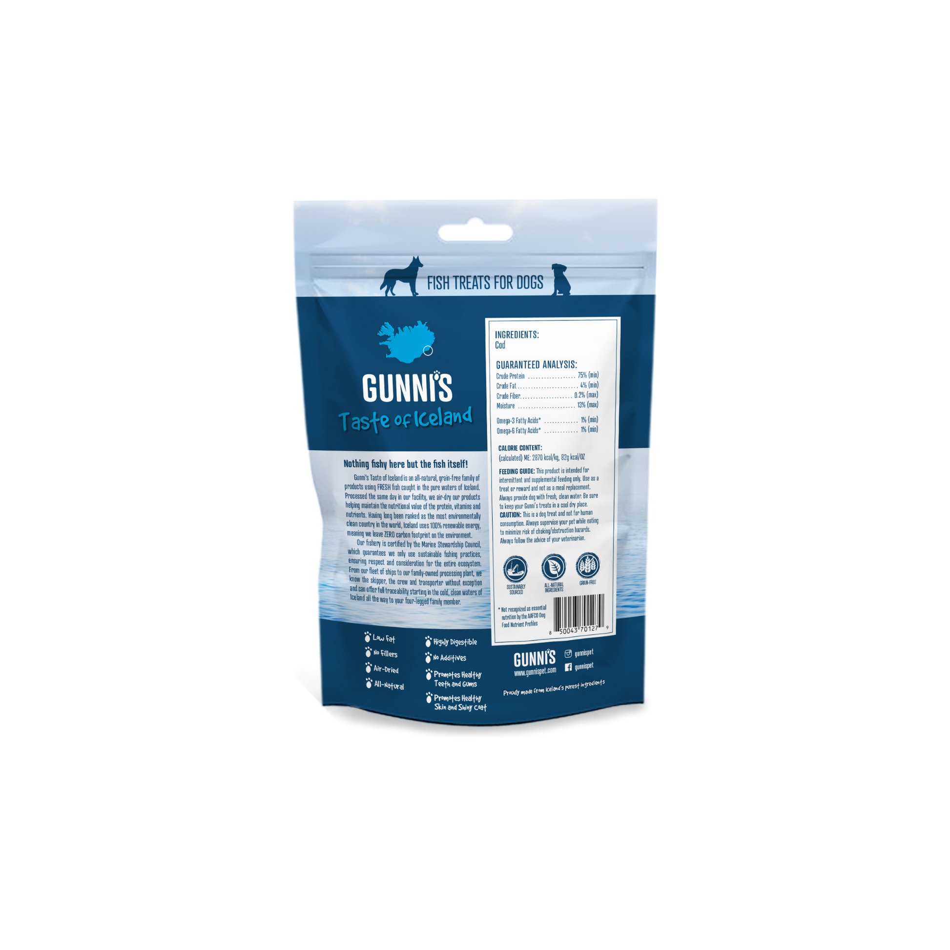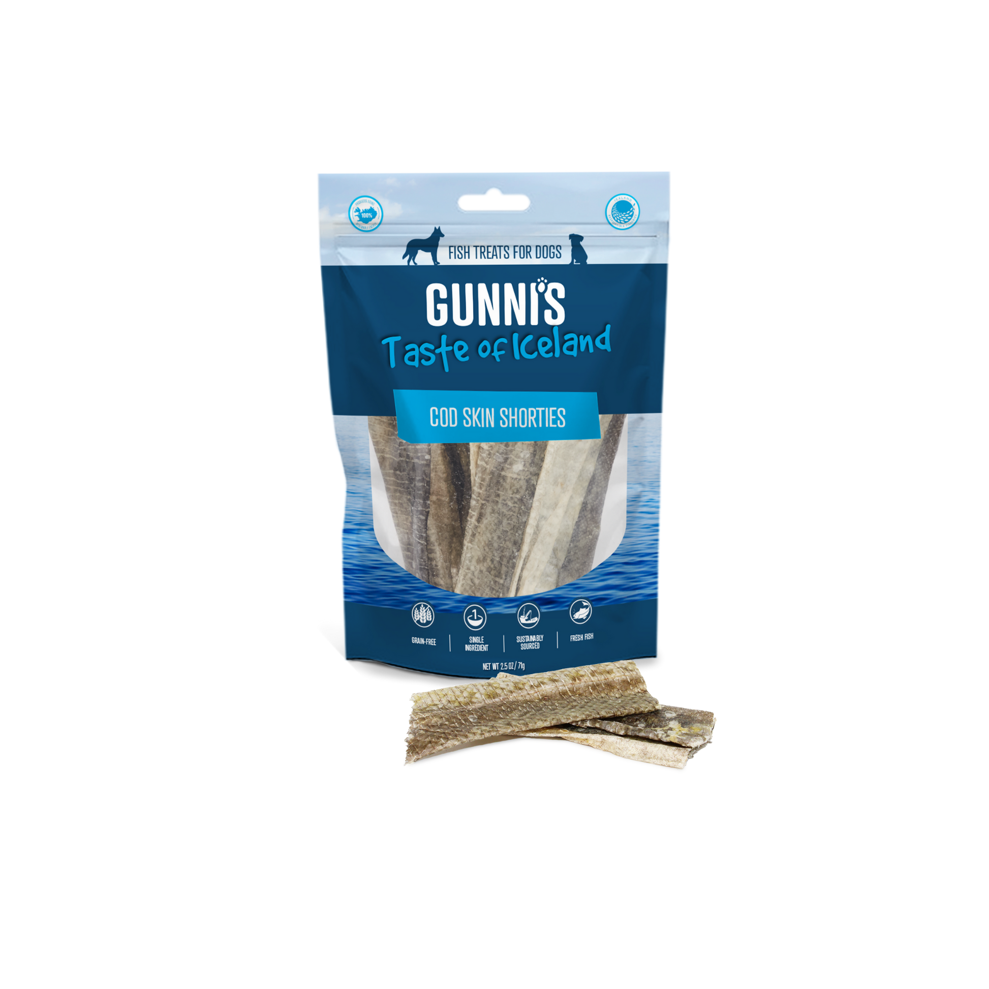 Cod Skin Strips eru stangir unnar úr þurrkuðu íslensku þorskroði. Stangirnar eru ca. 10 cm í lengd og er hin fullkomna viðbót fyrir hundinn. Gott fyrir tennurnar til að koma í veg fyrir uppsöfnun tannsteins.