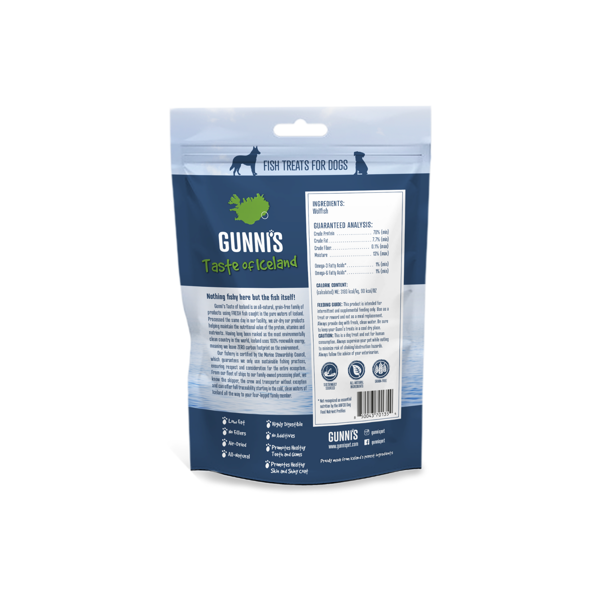 Wolffish Chewy Sticks eru ca. 10 cm langar handvafnar nagstangir úr íslensku steinbíts- og þorskroði. Kjarninn er úr þorskroði og ytralag úr steinbítsroði.