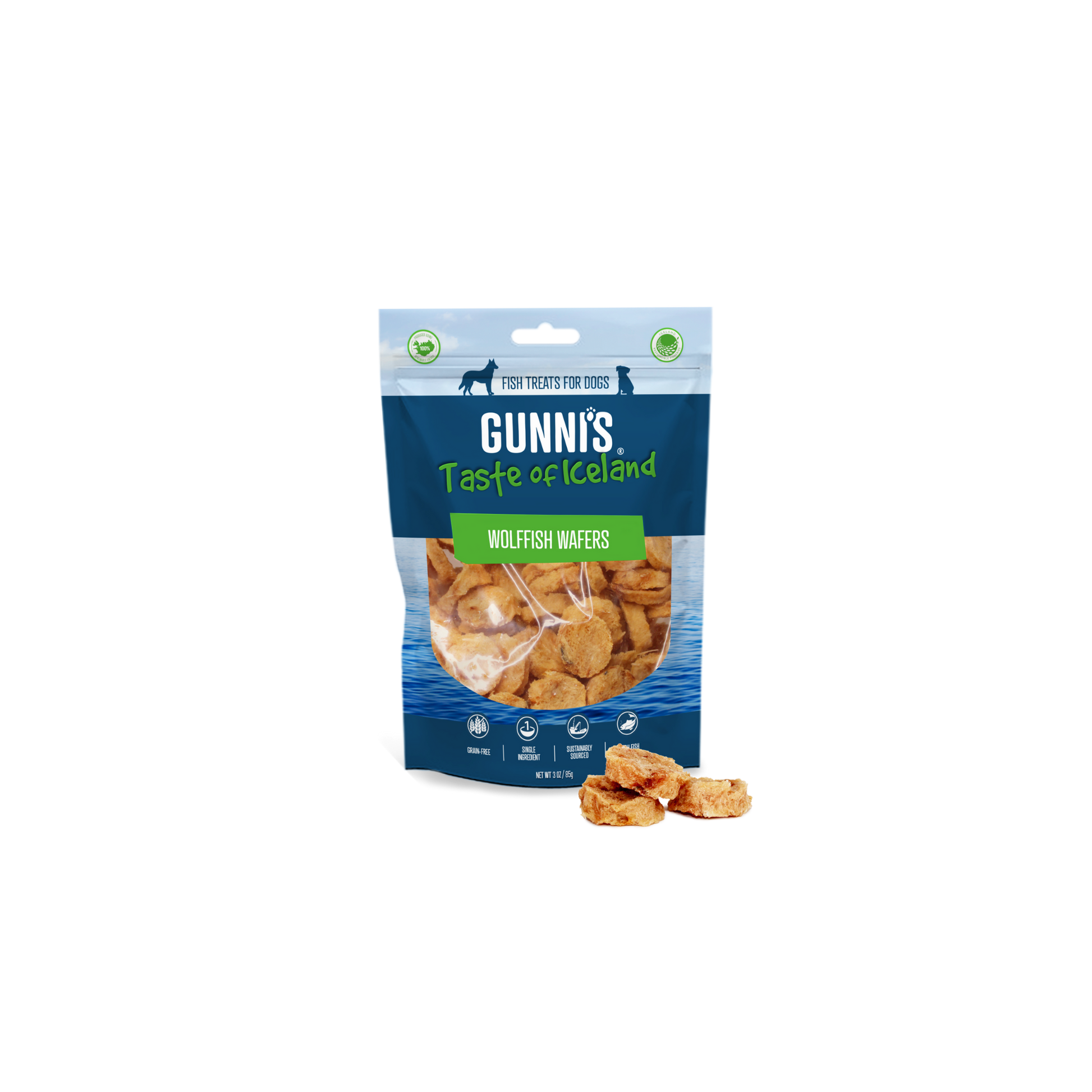 Wolffish Wafers eru unnið úr þurrkuðum Steinbítsflökum (roð- og beinhreinsað). Auðvelt að brjóta í minni bita, tilvaldir sem nammi eða við þjálfun.